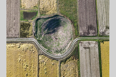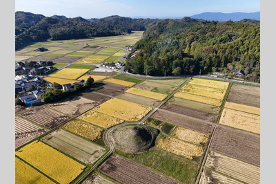 田んぼの中にふっと現れる小さな丘のような甲塚古墳。兜を伏せたように見える形が名前の由来とのことですが、ふんわりとした小山のような姿はかわいらしさを感じます。
