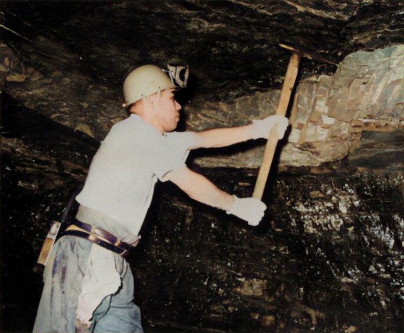 道具を用いた採炭の様子。用いているツルハシは坑内で扱いやすいように片刃となっている。腰に下げているものはヘッドランプのバッテリー。