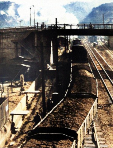 昭和35年の内郷駅(当時は綴駅)の様子。貨車に石炭が満載されている。石炭輸送で、当時の内郷駅は貨物取扱量が日本一であった。