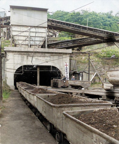 石炭を積んだ炭車と坑口、石炭を積む炭車の大型化に伴い、坑口は従来の馬蹄形から楕円形となっている。
